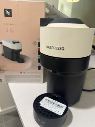 Cafetera Nespresso Vertuo Pop en color crema y negro. Diseño compacto y moderno. Nueva