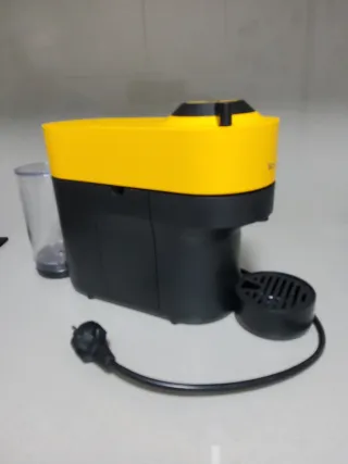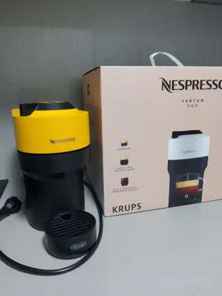 Cafetera Nespresso Vertuo Pop de Krups en color amarillo y negro. Diseñada para preparar diferentes tipos de café. - Modelo Vertuo Pop. - Marca Krups. - Color amarillo y negro.
