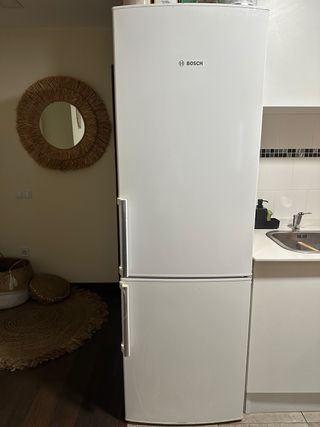 Nevera de la marca Bosch en color blanco. Diseño moderno y funcional. - Puertas con tiradores integrados. - Acabado liso y fácil de limpiar.