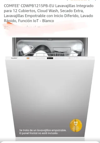 Lavavajillas integrado Comfee CDWPB1215PB-EU en color blanco. - Capacidad para 12 cubiertos. - Funciones: Cloud Wash, Secado Extra, Inicio Diferido, Lavado Rápido, Función IoT. - Tipo: Empotrable. - Nota: El panel frontal no está incluido.