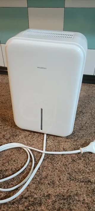 Deshumidificador de la marca Equation en color blanco. Cuenta con un diseño moderno y compacto. - Indicador de nivel de agua. - Rejilla de ventilación superior.esta usado 1 día