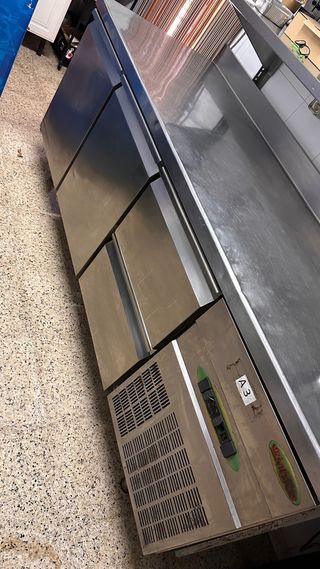 Mesa de trabajo de acero inoxidable con nevera integrada en la parte inferior. Ideal para cocinas profesionales o negocios de hostelería. - Superficie de trabajo amplia. - Compartimentos de refrigeración. - Diseño robusto y duradero.