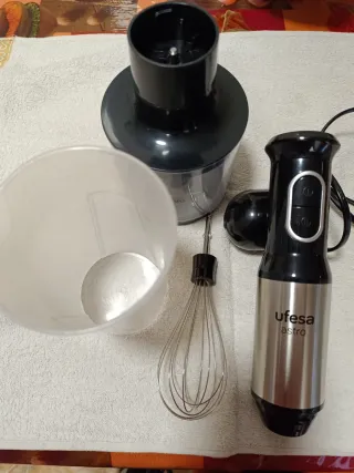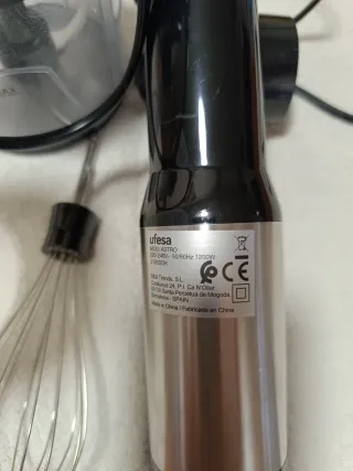 Picadora Ufesa Astro con accesorios. - Incluye varillas para montar. - Vaso medidor. - Cuerpo principal de acero inoxidable y plástico. ( no tiene el pie de batir )