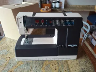 Máquina de coser Refrey modelo 940. - Diseño en blanco y negro. - Panel de control con selección de puntadas. Está estropeada la placa de alimentación.