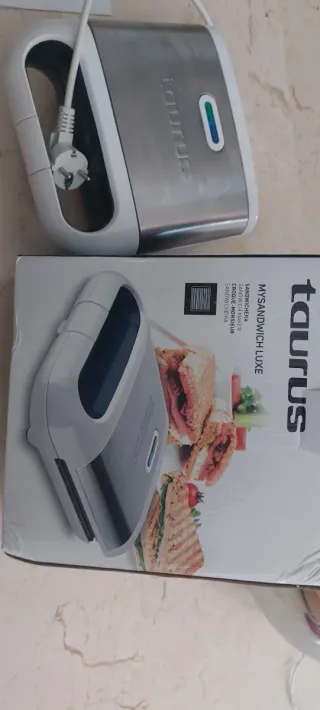 Sandwichera Taurus MySandwich Luxe en acabado acero inoxidable. - Diseño moderno y compacto. - Indicador luminoso de encendido y listo. - Asa de transporte integrada.