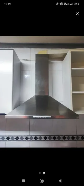 Campana extractora de cocina de acero inoxidable. - Diseño moderno y elegante. - Acabado en acero inoxidable. - Panel de control con botones. - Incluye dos lámparas. Funciona perfectamente
