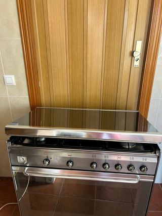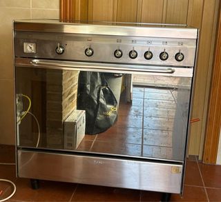 Cocina de gas de la marca SMEG con cinco quemadores y horno con función grill. Su diseño es de acero inoxidable y cuenta con un temporizador. - Cinco quemadores. - Horno con grill. - Acabado en acero inoxidable. - Temporizador. - Bandeja 35cm de fondo y 58 de ancho.