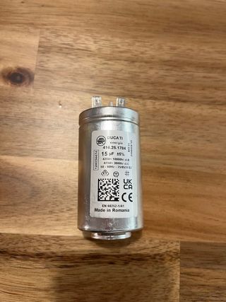 Recién comprado, sin uso. Condensador DUCATI energia. - Capacidad: 15 µF ±5% - Tensión: 425V- 10000h/cl.B, 475V- 3000h/cl.C - Frecuencia: 50-60Hz - Fabricado en Rumanía. - Certificación UK CA CE.