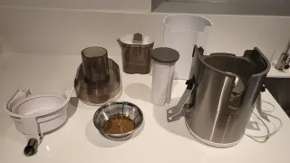 Robot de cocina Kenwood Chef Classic en color crema. Incluye todos sus accesorios, que se encuentran nuevos y sin usar. - La varilla es lo más desgatado. - Bol de acero inoxidable. - Varillas para batir y amasar. - Jarra para batidora. - Protector antisalpicaduras.