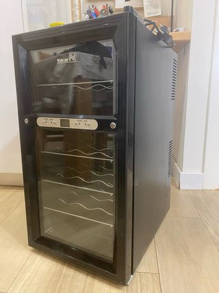 Vinoteca con capacidad para 18 botellas, dividida en dos zonas de temperatura independientes. - Capacidad total: 18 botellas (12 en compartimento inferior, 6 en superior). - Doble zona de temperatura. - Diseño elegante con puerta de cristal.