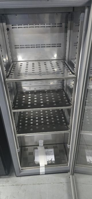 Nevera de acero inoxidable con dos puertas. - Diseño robusto y duradero. - Acabado en acero inoxidable. No funciona, probablemente por falta de gas