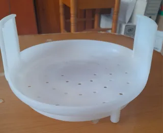 Este es un accesorio de cocina blanco. - Diseño redondo con asas. - Base con agujeros para drenaje. - Patas de soporte.