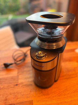 Molinillo de café Sboly con ajuste de molienda. - Diseño moderno y compacto. - Cuerpo de acero inoxidable y plástico. - Depósito para granos. - Selector de grosor de molienda.