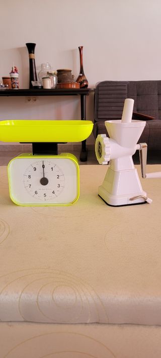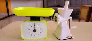 kitchen weighing scale, plastic, used in great condition. top comes off for transfer of products (flour, weat, etc) weight upto 10kg Mincer, plastic, (meat grinder) all removeable parts for easy cleaning. manual leaver with plunger