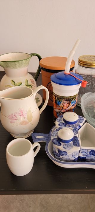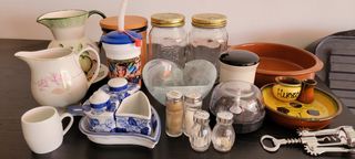 Job lot of kitchen stuff *water jug, white with lemons. *sitting on a small plate *sugar pot, french clay pot *2 glass quattro stagioni jars *ceramic bowl *olive 3 in 1 tapas bowl *sugar pot *glass fruit bowl *plastic kids cup *milk jug, white large *small milk jug *salt, pepper and sugar set with tray 4in1. blue floral *2x salt and pepper dispencers *plastic manual chopper *wine opener metal