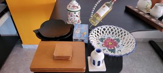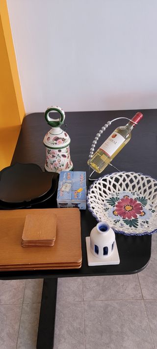 Kitchen and dining room items *5x dining table mats *5x coaster *small candle holder white *wooden candle t-light holder 6 tier *ceramic large fruit dish *metal wine holder *2x plastic leaf shape serving plates *large candle holder from Portugal *6x Japanese eye glasses (adults)