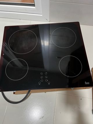 Placa de vitrocerámica Teka de 60cm. - Diseño moderno y elegante. - Superficie lisa y fácil de limpiar. - Controles táctiles intuitivos. - Bloqueo infantil - Todos sus fuegos funcionan correctamente. - Tiene algún arañazo. Se cambia funcionando por cambio de cocina.