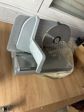 Cortador de fiambre eléctrico con diseño moderno y compacto. Maquina de corte fino para alimentos - Cuchilla de acero inoxidable. - Bandeja de plástico transparente. - Base antideslizante.