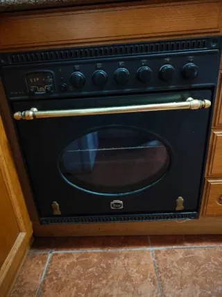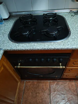 Conjunto de horno y fogones de gas para cocina. - Encimera de gas negra. - Horno vintage con tirador dorado a gas (casi sin uso).