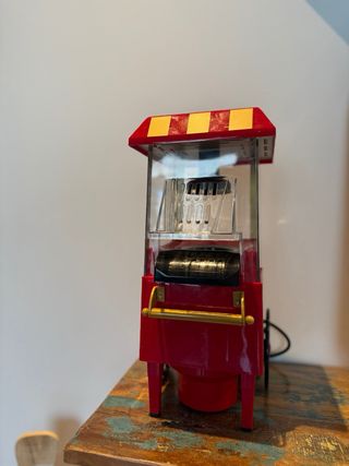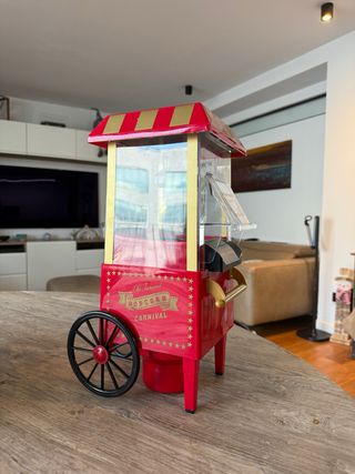 Máquina de palomitas con un diseño retro y divertido, inspirada en los carnavales. Usada 2 veces. - Estructura principal de color rojo. - Detalles dorados en el techo y los laterales. - Ventanas de plástico transparente. - Rueda decorativa negra con detalles rojos. MEDIDAS: 17,5l. x 17,5an. x 17,5al en cm. Solo entrego en Zona TV3-Broggi Sant Joan Despi. Pagos Paypal, Bizum o Wallapop. No negociable. No bajo precio. Precio Nueva 39€