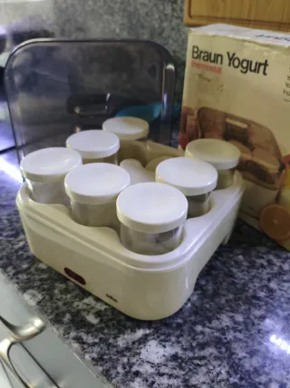 Yogurtera Braun modelo Thermostat con sus vasitos. - Diseño compacto y funcional. - Incluye 7 vasitos con tapa. - Color blanco crema. Más productos en mi perfil
