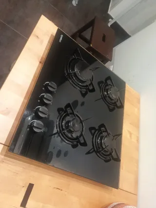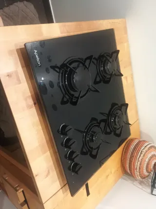 Placa de cocina a gas de la marca Apelson con superficie de cristal negro. - Cuatro fuegos. - Encimera de cristal templado. - Diseño moderno y elegante. - Funcionan los 4 fuegos, pero hay que mantener el mando presionado un rato más de lo normal. - Medidas: 50 x 60 medida exterior. Por dentro 55x.47 Yo la tenía puesta con gas natural, pero entiendo que si se le cambian los chiclés, valdría también para butano.