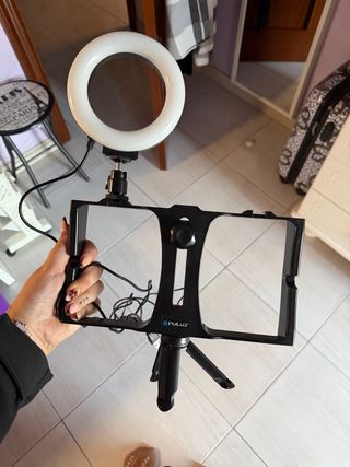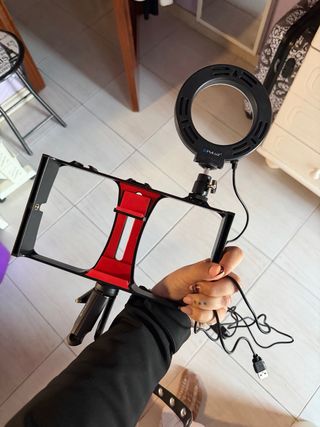 Kit de iluminación y soporte para móvil, ideal para principiantes. Incluye un aro de luz LED y un soporte ajustable para smartphones. - Aro de luz con iluminación LED. - Soporte universal para teléfonos móviles. - Trípode plegable integrado.