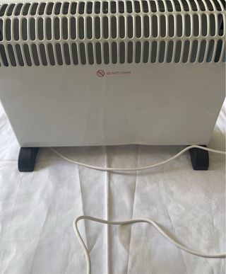 Estufa blanca con rejilla superior. - Indicación DO NOT COVER en rojo.