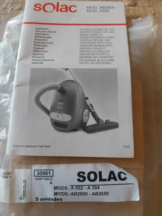 Pack de 5 bolsas para aspirador Solac. - Modelos compatibles: A 502, A 304, AB2600, AB2650.