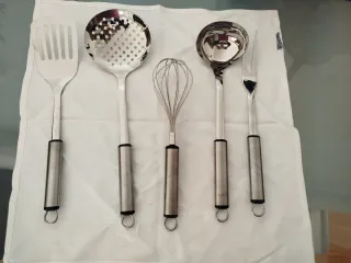 Set de utensilios de cocina de la marca CRC, línea Classic Range of Cuisine. Incluye 5 piezas. - Espátula ranurada - Cuchara ranurada - Batidor de varillas - Cucharón - Tenedor trinche