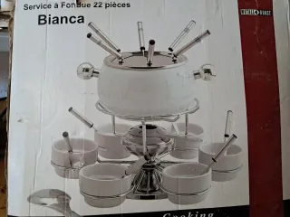 Set de fondue Bianca de 22 piezas. Incluye todo lo necesario para disfrutar de una fondue. - Olla de cerámica blanca. - Soporte metálico. - Quemador. - 6 cuencos. - 6 tenedores.