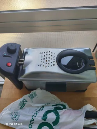 Freidora eléctrica Moulinex Uno de acero inoxidable y plástico negro. Utilizada una sola vez - Diseño moderno y compacto. - Asa negra para un fácil manejo. - Cesta de freír de malla metálica.