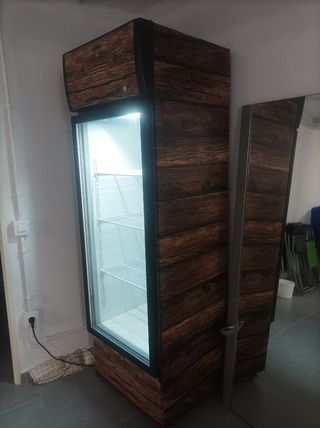 Nevera expositora con puerta de cristal, ideal para negocio. Está en buen estado. - Diseño de madera. - Tres estantes. - Iluminación interior. - Visor de temperatura. Solo recogida