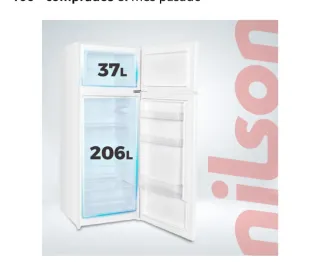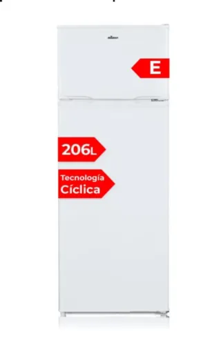 Frigorífico de dos puertas con congelador de la marca Nelson. Tiene una capacidad de 206L la nevera y 37L el congelador. Con tecnología cíclica. - Color blanco. - Etiqueta energética E.