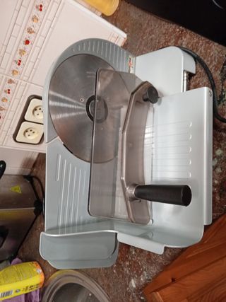 Cortafiambres eléctrico para el hogar. - Cuchilla de acero inoxidable. - Protector de seguridad para la cuchilla. - Base antideslizante.