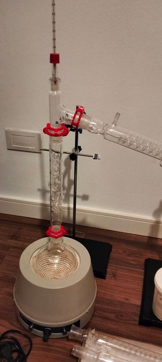 Se vende equipo de destilación fraccionada. -Manta eléctrica para matraz 350w -Matraz de 1 litro -Torre fraccionada -Tapon termómetro -Termometro -Acople T -Serpentin refrigeración 2 unid. -Tubo de refrigeración simple -Densimetro + vaso -Base sujeción hierro fundido 2 unid. -Pinzas de sujeción 2 unid. -Pinza anclaje multifunción. -Grapas 3 unid. -Esferas de cristal anti ebullición 1kilo -Silicona sanitaria 900gr Todo en vidrio de calidad, comprado en almacén de suministros de laboratorio. Se ha utilizado 4 veces para hacer ginebra casera. Los resultados son muy buenos en comparación con destiladoras de metal.