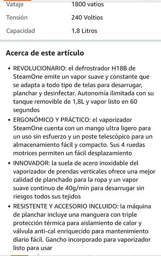 Plancha vertical SteamOne H18B, nueva a estrenar, con caja. 1800W, con todos los accesorios. Le falta una pequeña pieza para enroscar el tubo perchero (se puede sujetar con silicona o de cualquier otra forma, ver última foto) Características en las fotos. Precio en tienda 175€