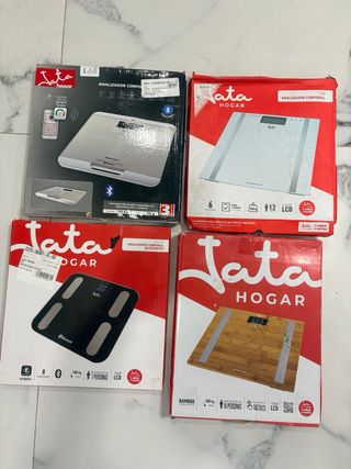 Conjunto de básculas Jata Hogar analizadoras corporales, cada báscula vale 5 €. - Báscula con carcasa blanca y pantalla LCD. - Báscula con carcasa plateada y pantalla LCD. - Báscula negra con pantalla LCD y conectividad Bluetooth. - Báscula de bambú con pantalla LCD.