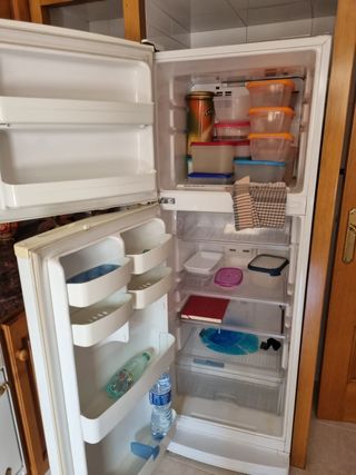 Nevera y congelador blanca con varios estantes y cajones. - Estantes interiores de cristal. - Cajones inferiores para alimentos. - Puerta con compartimentos. - Altura 1.90m