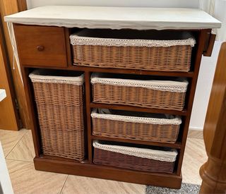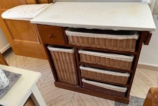 Mueble plancha de madera con aleta extensible para facilitar el planchado y con varias cestas de mimbre. Medidas: - Largo: 86,5 cm (133,2 cm con aleta extendida) - Ancho: 46,3 cm - Alto: 86 cm
