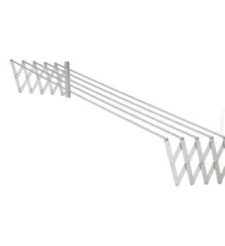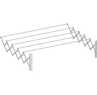 Tendedero extensible con diseño de acordeón, ideal para optimizar el espacio. Se fija a la pared y se despliega fácilmente. - Largo: 180 cm. -desplegado mide 71cm de ancho. - acero en epoxi blanco. - Construcción metálica resistente.