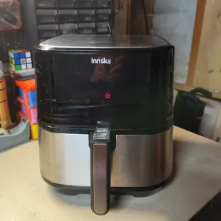 Freidora de aire de la marca Innsky con un diseño moderno y funcional. - Acabado en acero inoxidable y negro. - Indicador luminoso de funcionamiento.