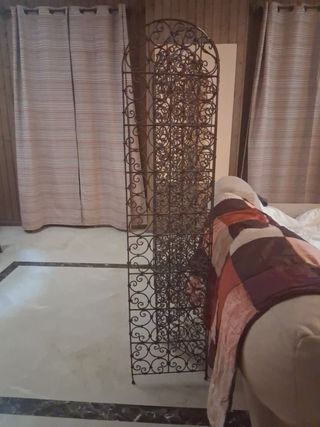 Preciosa pantalla decorativa de 5 hojas. Ideal para separar ambientes o como elemento decorativo. - Fabricada en hierro con un diseño rústico. - Color marrón oscuro. - Estilo elegante y sofisticado. - En buen estado.