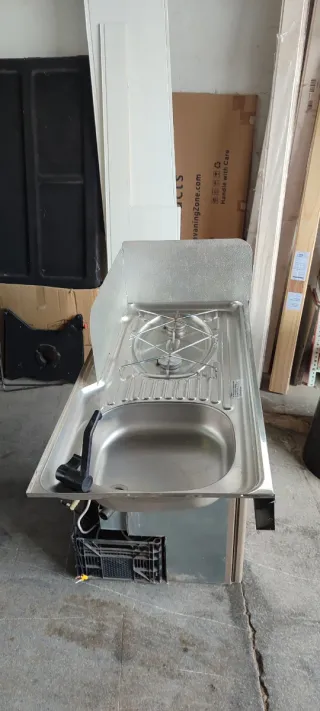 Módulo de cocina completo con fregadero y cocina de gas, ideal para autocaravanas o furgonetas camper. Incluye un frigorífico trivalente. - Cocina de gas con varios fuegos. - Fregadero integrado. - Frigorífico trivalente (funciona a 12V, 220V y gas). - Diseño compacto y funcional.