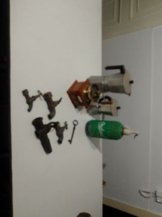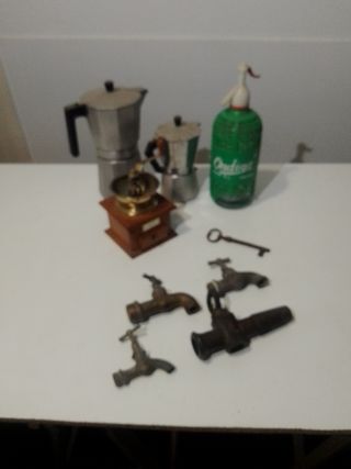 Cafetera 10 y 20€ sifón 10€ molinillo café 25€ grifo latón 12€ cada uno billón de bodega billa latón bronce 20€ llave antigua 10€ artículos para decoración. puede que no funcionen o presenten algún roto o deterioro.