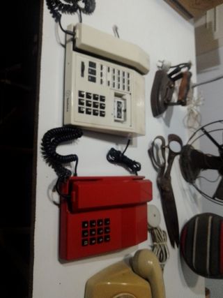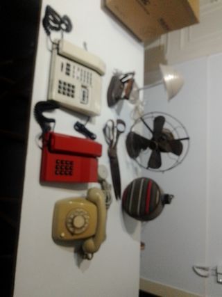 Ventilador AEG de 1926 (pesa unos 3kg) aproximadamente 80€ plancha 35€ flexo 30€ teléfono Teide rojo 30€ teléfono con contestador de cinta 40€ teléfono heraldo con cable y roseta 50€ tijeras de Sastre 70€ cantimplora 30€