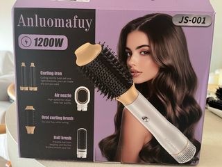 Secador-cepillo de aire Anluomafuy con múltiples accesorios para peinar. - Potencia de 1200W. - Incluye: Curling iron, Air nozzle, Oval curling brush y Half brush. - El curling iron permite crear rizos en ambas direcciones. - El air nozzle es un secador de alta velocidad. - El oval curling brush seca y riza el cabello simultáneamente. - El half brush previene enredos y alisa el cabello.