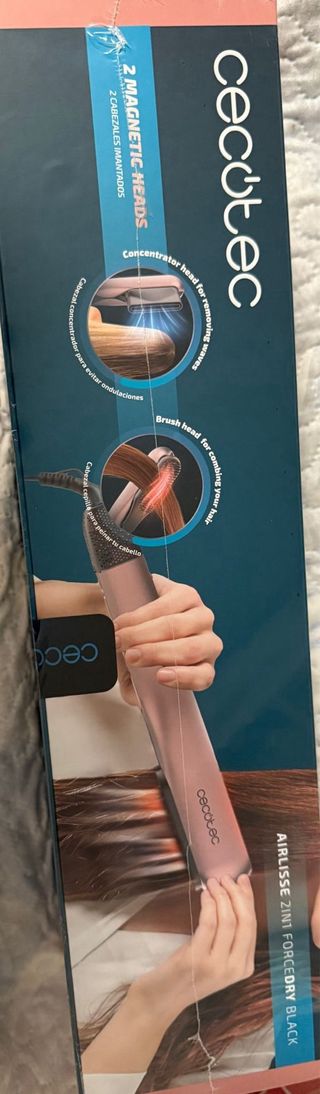 Secador, ondulador, alisador. Fue un regalo para mí hija, que lo saco y lo guardé. No se devolvió, porque no teníamos ticket. Y sí que funciona, pero he hecho un vídeo y no me deja subirlo. La ficha la pusimos, porque tenemos una 🐕 y mordió el cable, pero está nuevo y sin usar.