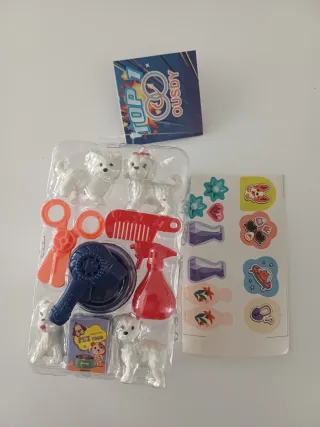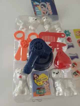 Divertido set de peluquería canina para jugar. - Incluye 4 figuras de perros. - Accesorios de peluquería: secador, tijeras, peine, pulverizador y pienso. - Incluye pegatinas decorativas.