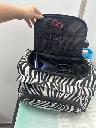 Conjunto de herramientas para el cuidado de mascotas. - Máquina cortapelos profesional km10 - Tijeras de peluquería de acero inoxidable de esculpir y curva - Cepillos para perros de diferentes tipos. - Peines metálicos. - Secador de pelo - Neceser con estampado de cebra.